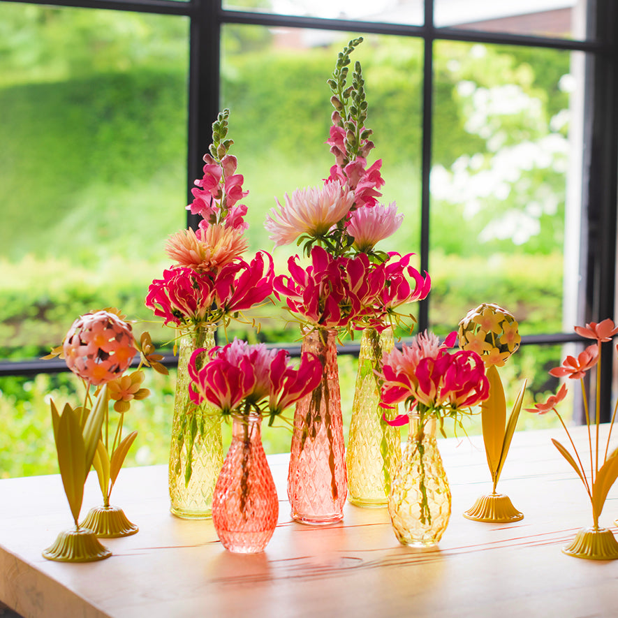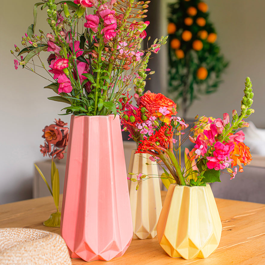 Geïnspireerd door de levendige fruitkleuren en kleurverlopen van bananengeel, mango en perzikroze, brengen onze vazen en keramiekproducten een frisse, speelse uitstraling. Zesty Blush combineert fun, speelsheid en verfijnde elegantie, perfect voor een sprankelende en kleurrijke zomer.